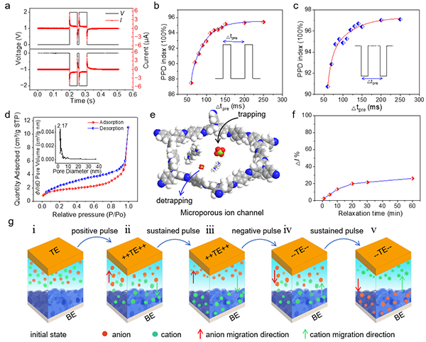 圖2 (a)正負脈沖下器件的雙脈沖抑制(PPD)行為,(b)和(c)隨脈沖間隔時間變化的PPD指數,(d)薄膜孔徑分布,(e)理論條件下膜的孔徑,表明離子通過膜的遷移,(f) 6次抑制后不同靜置時間電流增加比例,(g)離子功能層中輸運存儲機制