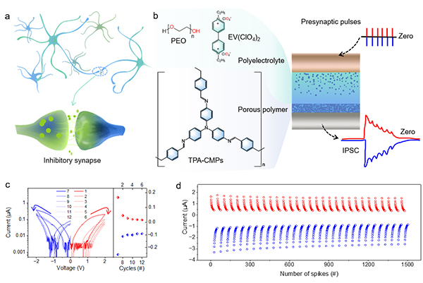圖1 (a)生物體中抑制性突觸示意圖,(b)器件結構,(c)連續直流掃描下器件的電流變化,(d)連續交替脈沖刺激下電流變化